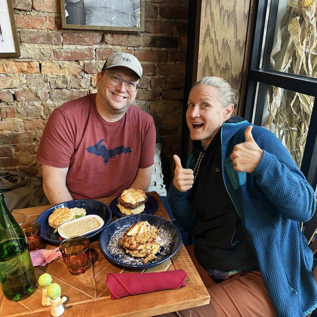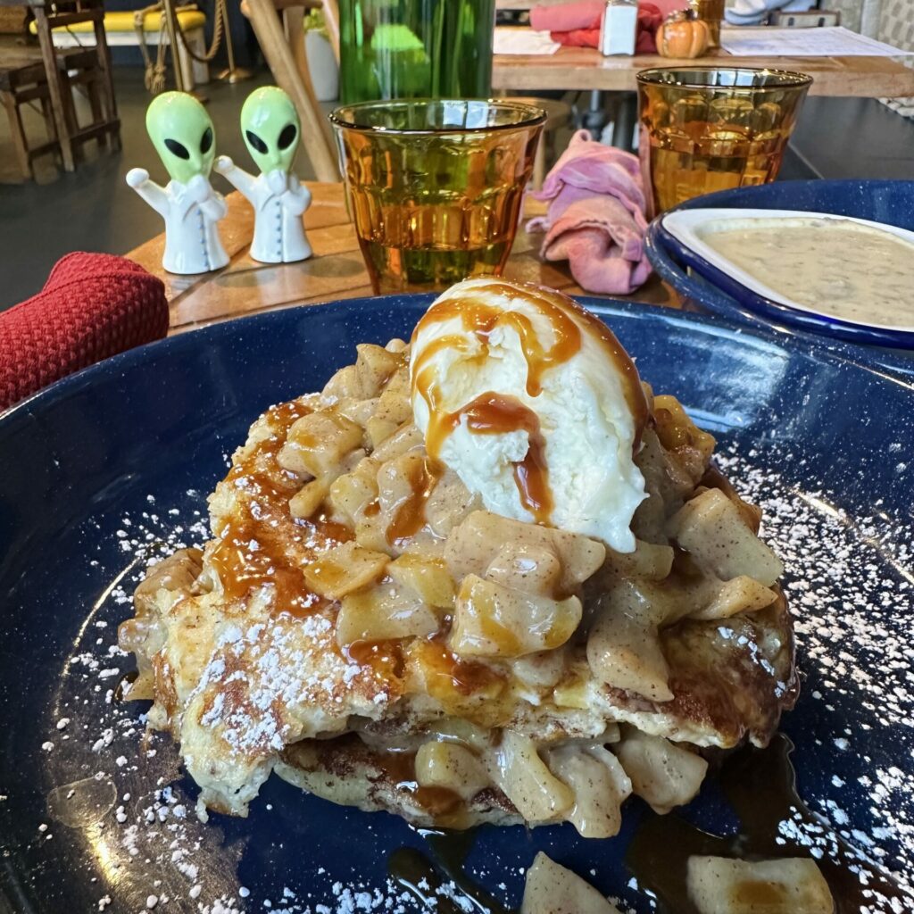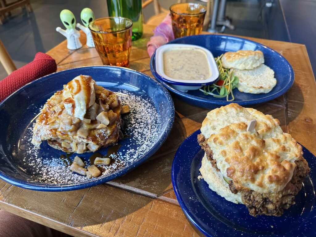 also. we ate so much. i had the caramel apple pie french toast biscuit (um, what?). it was amazing. derek had chicken or something. whatever. and of course we had to try the biscuits and gravy.