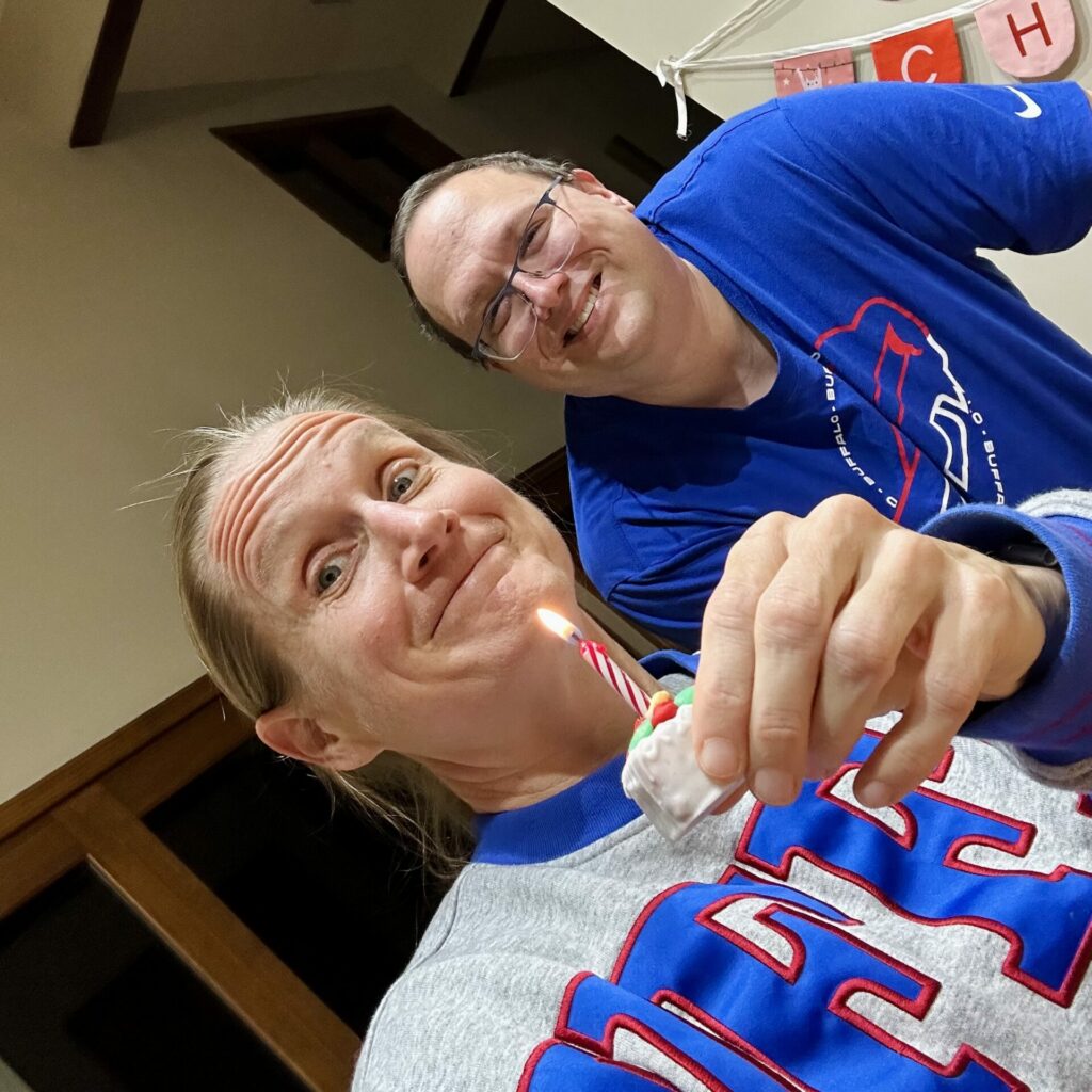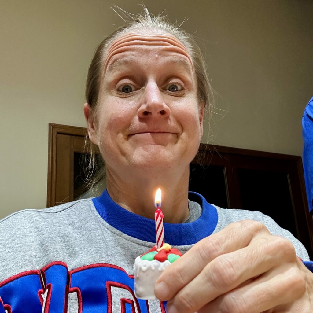 derek’s parents came over after the game for my official birthday cake moments. at first derek tried to pretend that this little petit four was my cake.