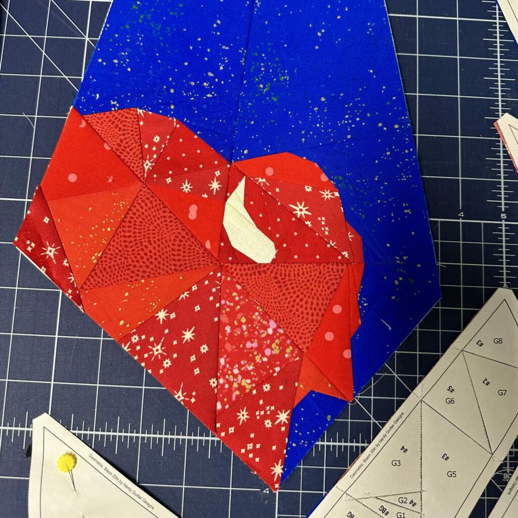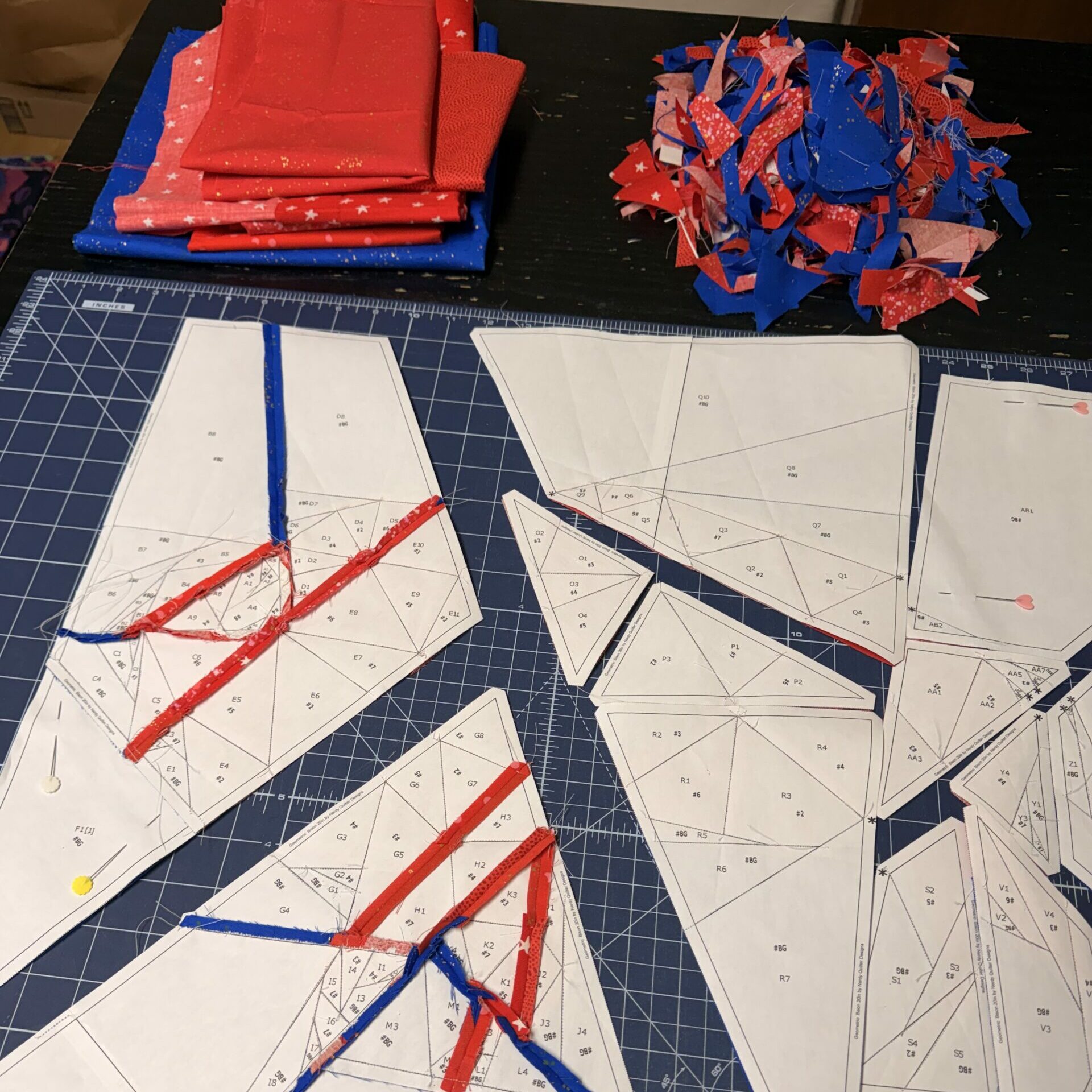 fast forward to december. i’ve been hobbled by some stupid injuries/health nonsense and we are in the thick of another football season with hopefully a deep (superbowl) playoff run. i didn’t have much sew mojo, but if anything can snap me out of a slump, a paper piecing project can. so, i printed out another pattern, cut all the tiny pieces, pulled out a lot of the same fabrics, and got to work again. it came together quickly. ripping out the papers is still the worst.