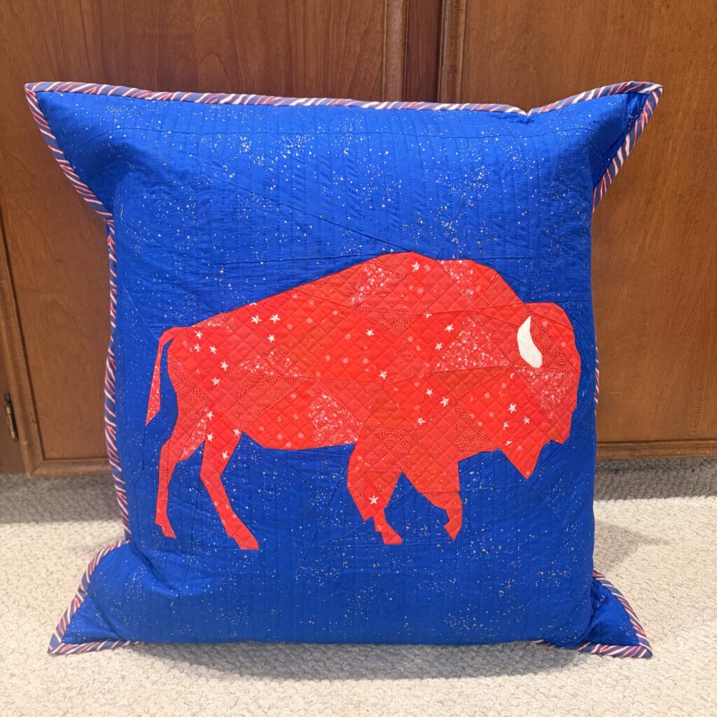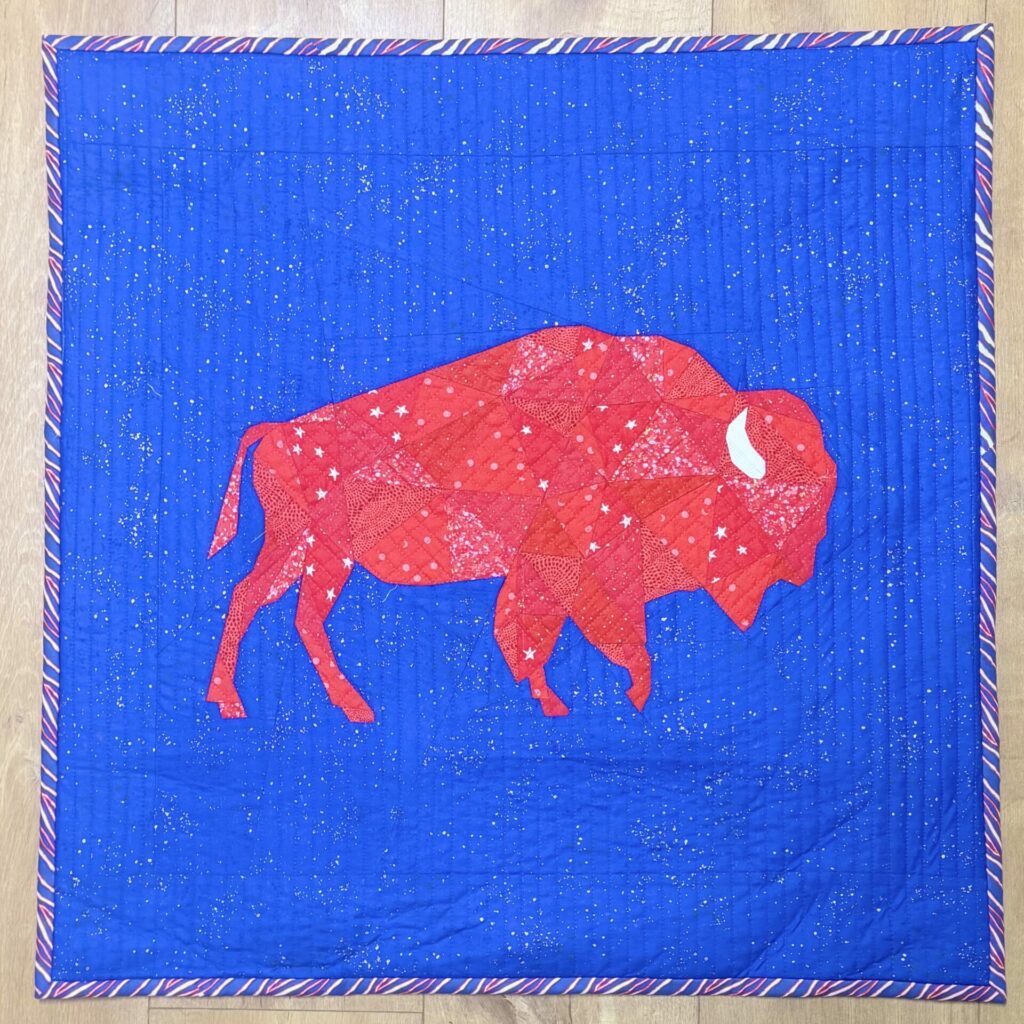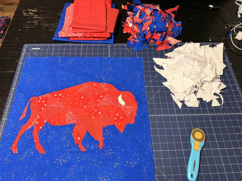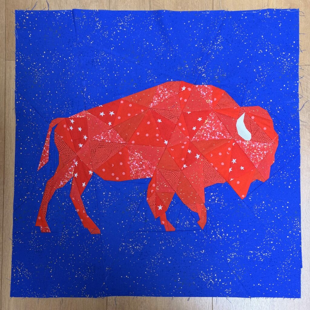 so. back in march, after enough time had passed from another heartbreaking defeat in the playoffs, i was ready to partake in fan related activities once again. a few years ago, i made hazel’s teacher a class gift, using a geometric bison pattern from nerdy and quilty. since then i have wanted to make it into a bills themed block, and with my friend (and fellow western new york ex patriot) jude’s birthday coming up, i had the perfect opportunity….