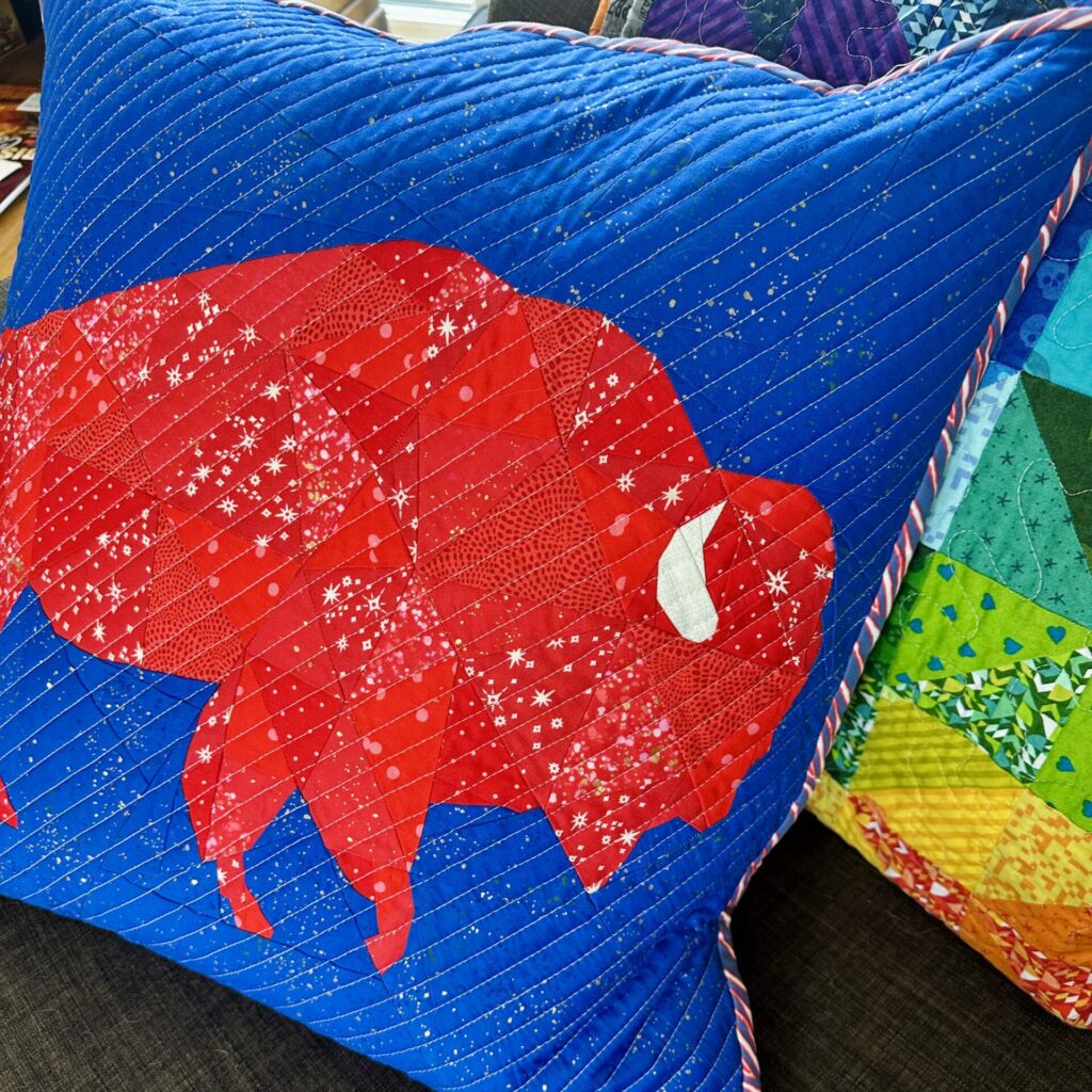 this time, i spent some time with somewhat custom quilting. my quilty friend suggested a grid inside the buffalo and vertical lines outside. also, i switched thread colors. look at me go… it took a bit longer, but this sort of quilting is for sure easier on smaller projects. it’s harder to see on the front, but the back shows the details. and the loose threads that graciously do not have to be buried or pretty in a pillow where no one will see the back (unless you post it on the internet).