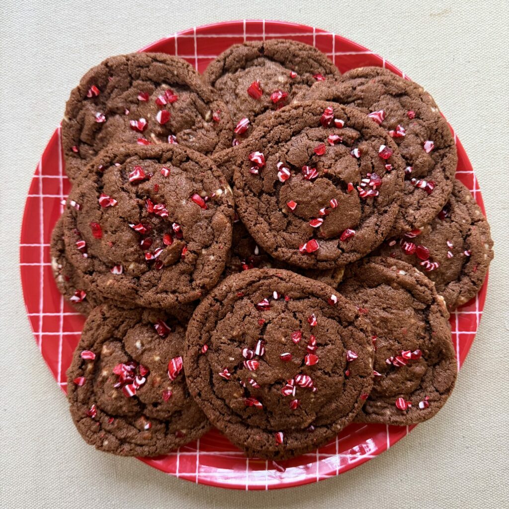 i am aware that i had an entire separate post dedicated to christmas cookie decorating, but bear with me for a few pics of some non sugar cookie cookies. there were A LOT of double chocolate peppermint cookies. anna baked them for her biz. i made them for hazel’s teachers. i put them in my cookie gift plates. and. i ate about 128 of them. (and still threw a bunch out on january first). hazel helped me with way too many m&m cookies. and this year i brought back the very labor intensive turtle thumbprints, which look cool and taste good, but might not be worth the trouble. not when everyone just wants to eat the easy seven layer bars. also, derek made some candied(?) cranberries, which are as delicious as they are photogenic.