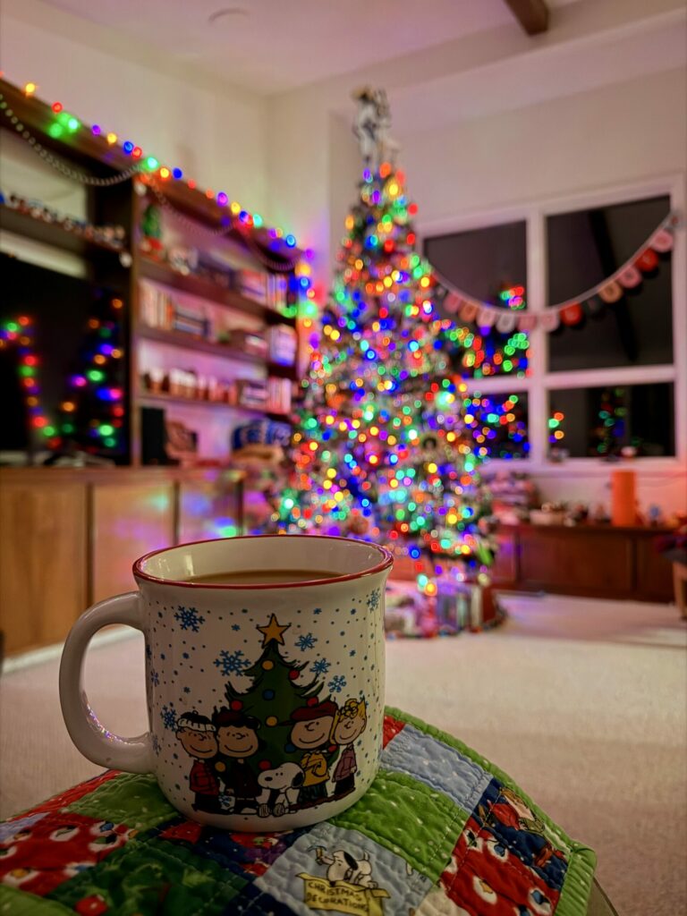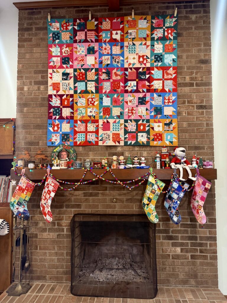 when i first started pulling photos for this post, i had like seven different pics of my morning coffee in the dark by the light of the christmas tree, but i determined that one would suffice. but. i would be remiss if i didn’t also show you this years decor upgrade. a few months ago, derek put up some quilt hangers above the mantle, but they only can fit a quilt that is 60-64″ wide, and less than 68″ long. the quilt that hangs there most of the year is the perfect size, and i thought i would have to make a new christmas quilt for the space if i wanted to switch it out for the season, but the ribbon candy bear paw i made a couple of years ago had perfect specs for the space. it also perfectly fits my decor genre. colorful chaos christmas.
