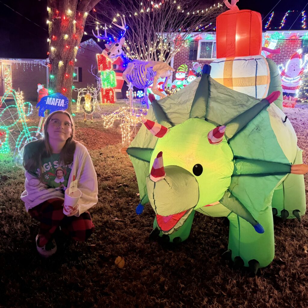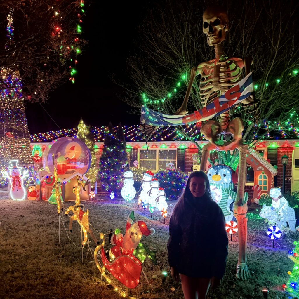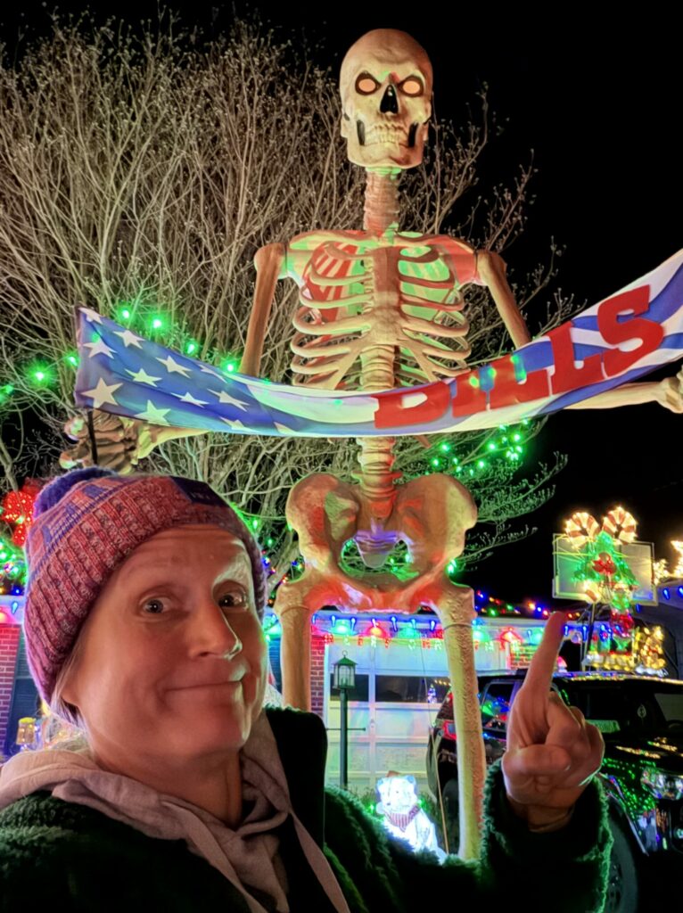 every year, we have the same debate about going to see the tanglewood festival of lights. the usual talking points are: it costs too much, its the same thing year after year, the wait is like 17 hours, the kids never really seem to care. then some years, we suck it up and do it anyways, and then vow to never do it again. other years, we remember the vow, and skip out. this year, after the usual back and forth, we decided to drive around ws/nc instead, and hit up some private/personal light displays. we even enlisted our permitted teen driver and scored some night time driving hours for her. our final stop on the tour was the neighbor of one of our good pals. we were able to park in our friend’s drive and walk amongst the displays. the neighbors are western ny transplants, so there was a good bit of bills fandom in the mix, as there should be.