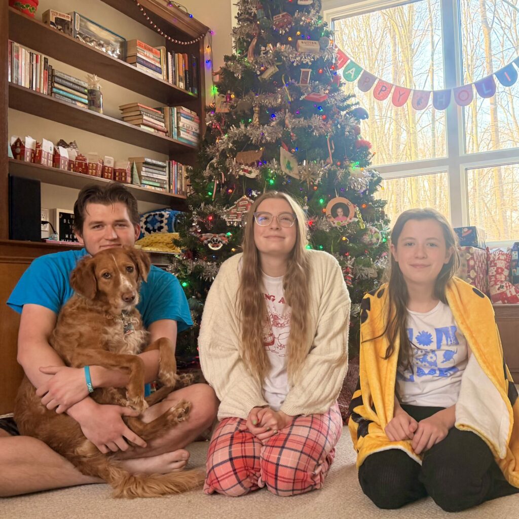 when i say i had plenty of time, i really meant hours upon hours. these teens and tweens just sleep their little hearts out. same for the middle aged dog. but eventually, they awakened, ready to learn what riches are to be bestowed upon them. but first, the obligatory christmas tree pic.