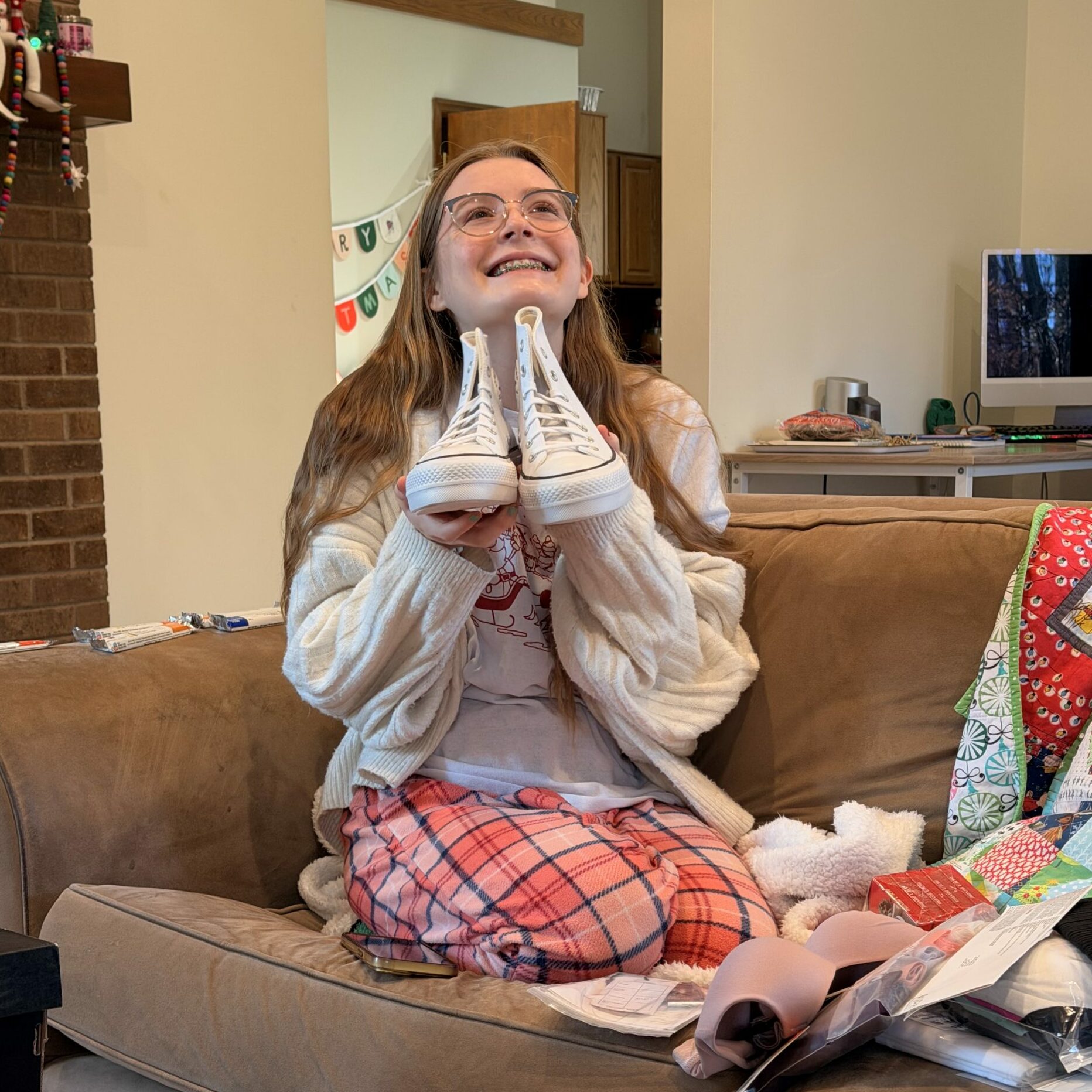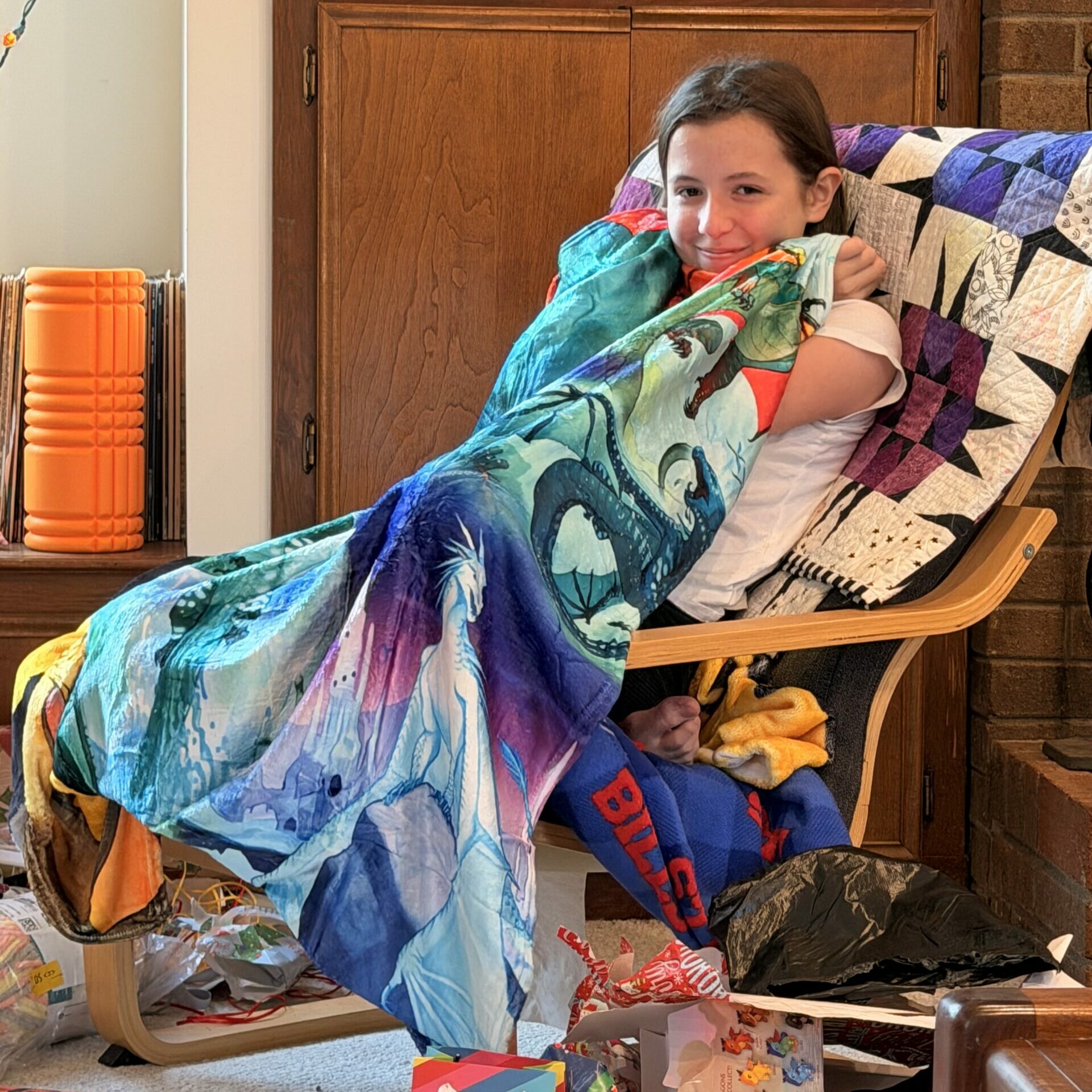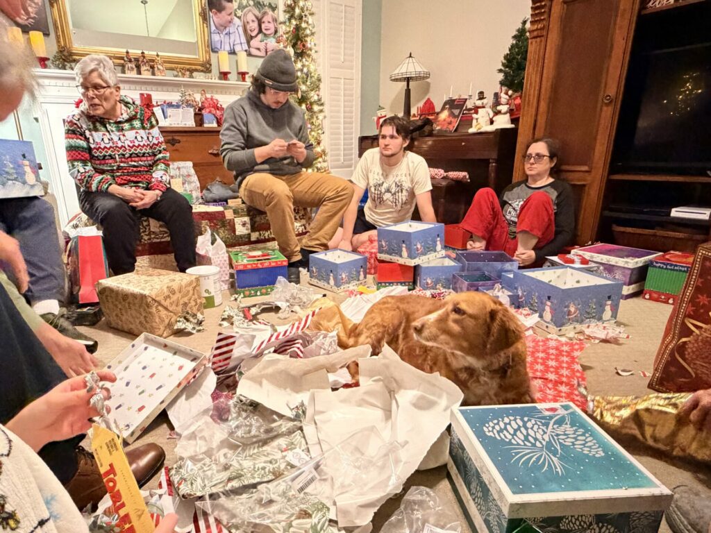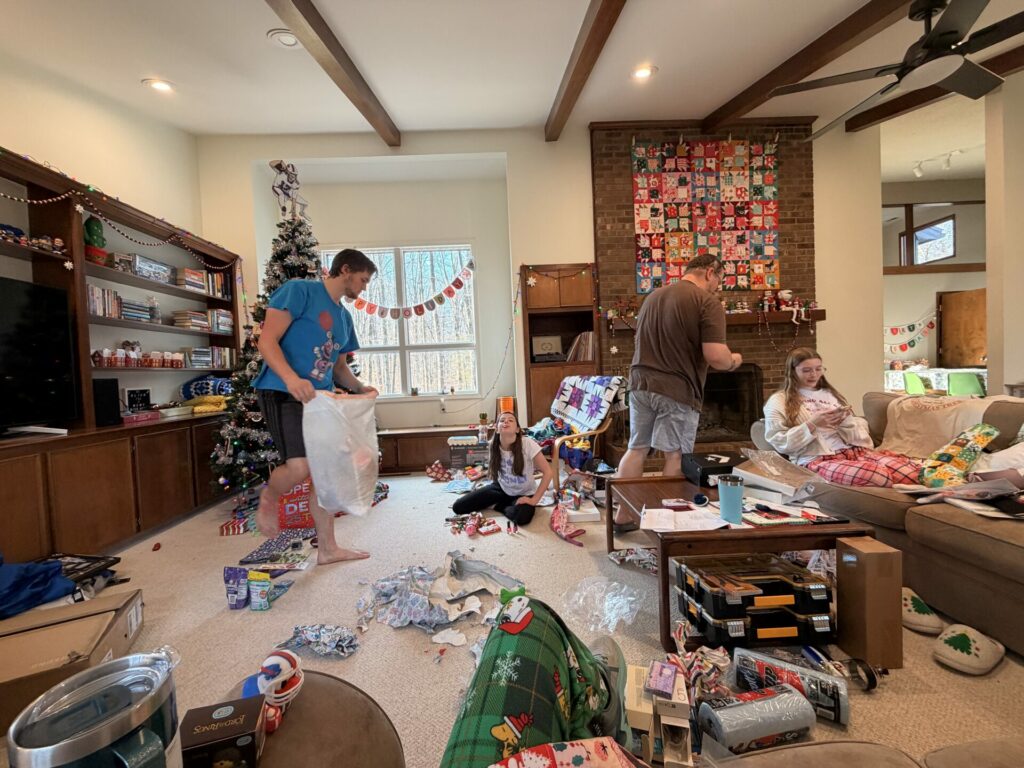 then. i proceeded to do an absolutely terrible job at taking pics of them opening our gifts. it was all pretty quick since they all got something big this year (sewing machine for hazel, guitar for anna, gaming monitor and drive for ike). but i was sure to get some shots of them opening gifts from long distance family.